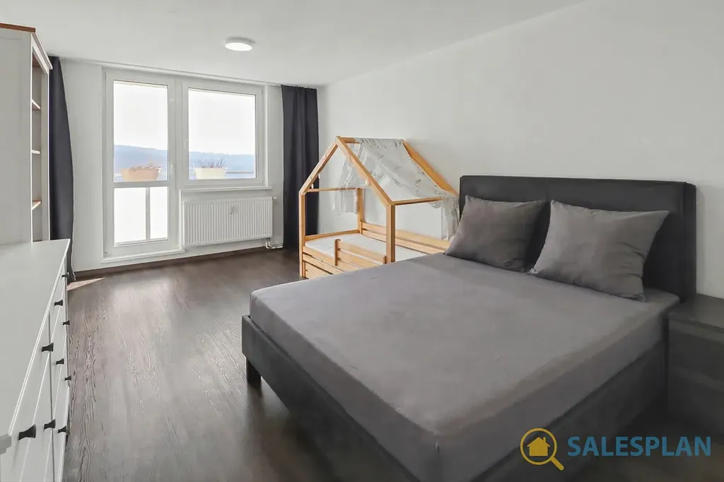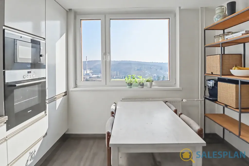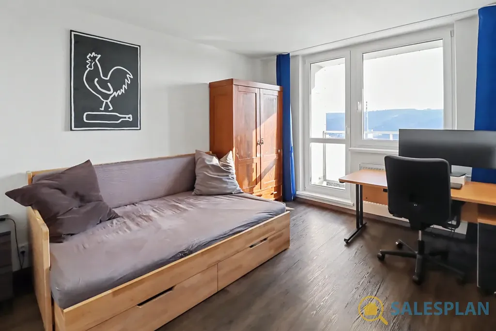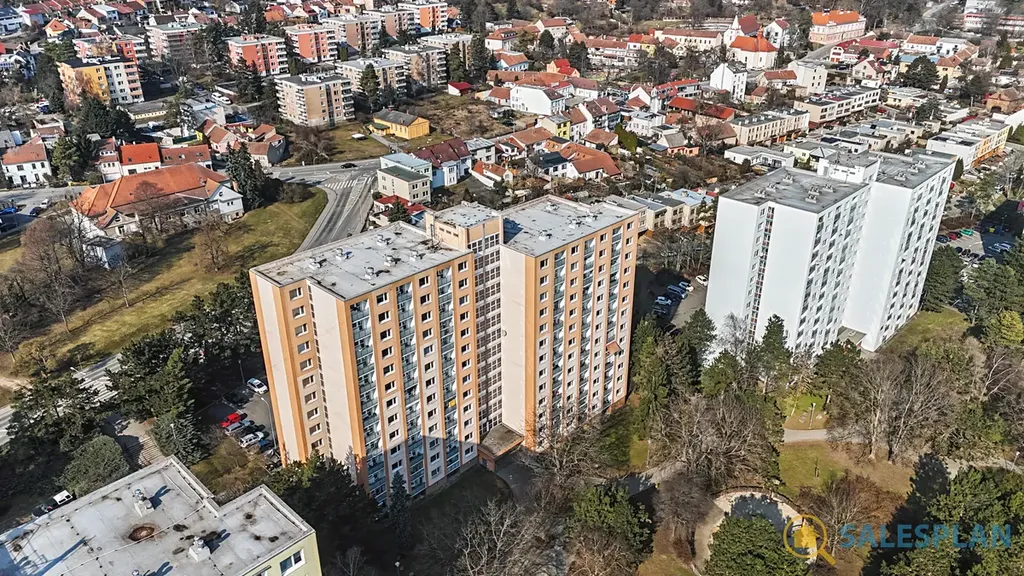 Jednotka je umístěna v desátém patře panelového domu s panoramatickým výhledem. Byt prošel v minulosti kompletní a velmi zdařilou rekonstrukcí. V rámci její realizace byl kladen důraz na kvalitní provedení, vysoký standard a využití prémiových materiálů a zařízení. Dispoziční řešení bytu je velmi efektivní, s možností budoucí úpravy uspořádání na 3+kk. Místnosti jsou samostatné a neprůchozí. Skládá se z velkorysého obývacího pokoje, ložnice a kuchyně. Ložnice i obývací pokoj disponují vstupem na prostorné lodžie. Zděná koupelna a toaleta jsou řešeny samostatně. Nespornou výhodou je šatna přístupná z centrální chodby. K jednotce náleží také sklep umístěný v suterénu.