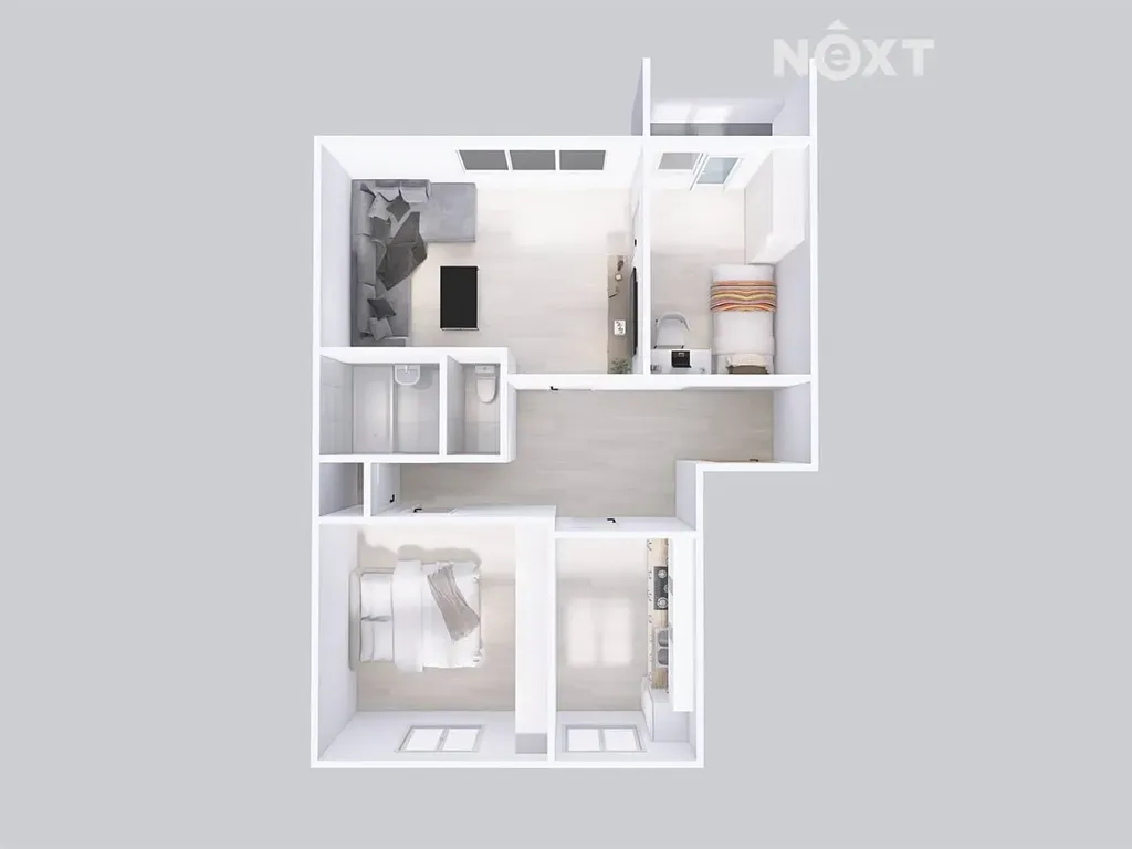 Dispozičně je tento byt opravdu zajímavý, a pokud máte rádi moderní otevřenou dispozici obýváku s kuchyní, tak tady by to mělo být možné.