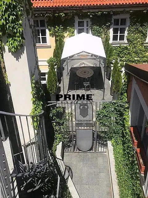 Prostorný, 3 ložnicový, nezařízený byt se 2 koupelnami k pronájmu, 4+1, 178m2, s jižně orientovanou terasou o výměře 35m2, situovaný ve 2. patře kompletně zrenovovaného historického domu s výtahem a malebným zeleným nádvořím s fontánami.