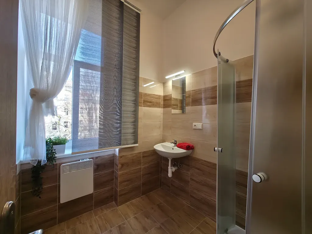 Z kuchyně (14 m2) je vstup do koupelny s oknem (6 m2) do klidného vnitrobloku se zahradami.