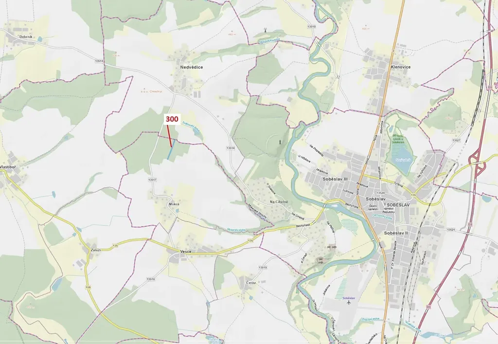 Lesní pozemek o výměře 5196 m2, parcelní číslo 300, podíl 1/1, katastrální území Mokrá u Soběslavi, obec Vesce, obec s rozšířenou působností Soběslav, okres Tábor, Jihočeský kraj. Po těžbě.