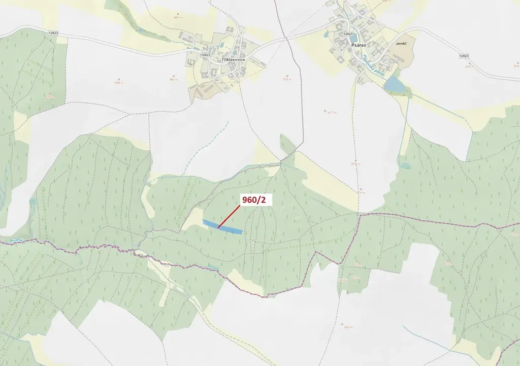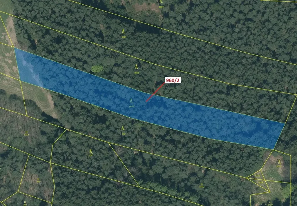 Lesní pozemek o výměře 7607 m2, parcelní číslo 960/2, podíl 1/1, katastrální území Psárov, obec Psárov, obec s rozšířenou působností Tábor, okres Tábor, Jihočeský kraj. Po těžbě.