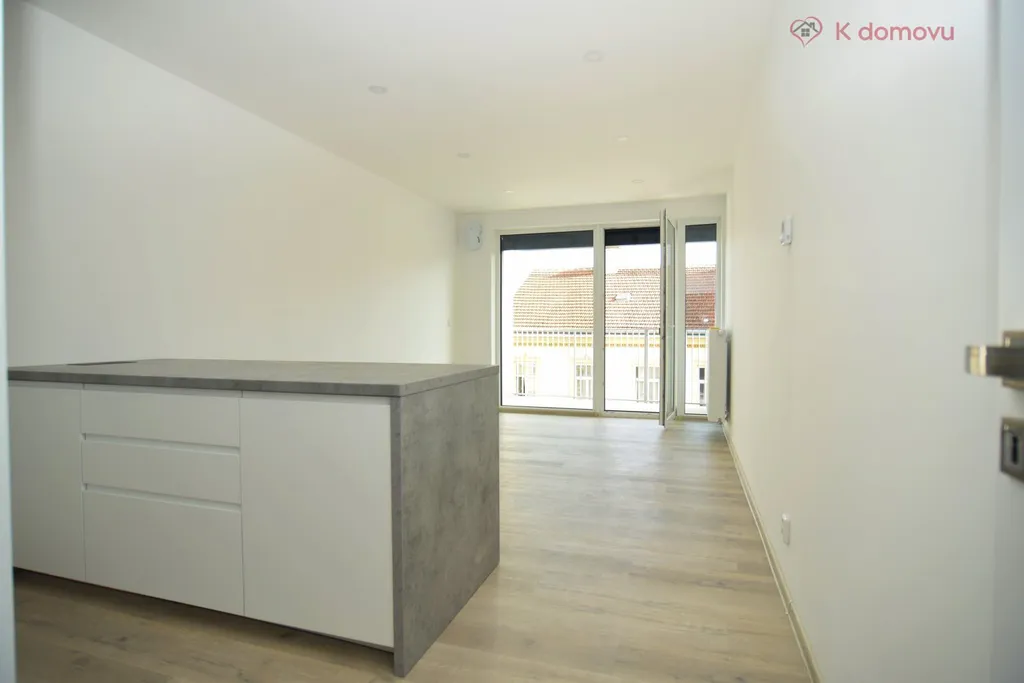 Bytová jednotka se nachází ve 4. nadzemním podlaží sedmipodlažního nového bytového domu s výtahem. Z předsíně se vchází rovnou do prostorného pokoje s kuchyňským koutem, který je zařízen moderní kuchyňskou linkou vybavenou indukční varnou deskou s digestoří, elektrickou troubou, lednicí s mrazákem. Koupelna je vybavena bezbariérovým sprchovým koutem, závěsným WC a pračkou kombinovanou se sušičkou. K bytu náleží sklepní kóje o výměře 3 m2. Byt je vybaven rekuperační jednotkou. K relaxaci lze využívat malou zahradu, která vznikla ve dvorním traktu.