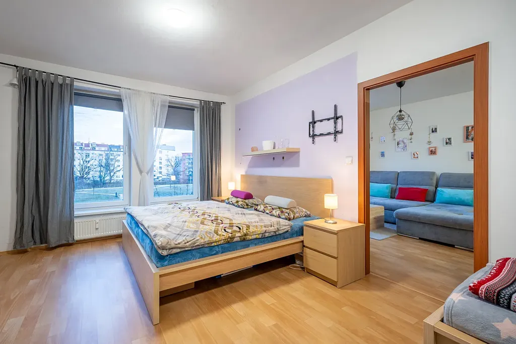 Dispozice bytu zahrnuje obývací pokoj s kuchyňským koutem, samostatnou ložnici, koupelnu a předsíň. Z obývacího pokoje je vstup na balkón, který nabízí příjemné místo k odpočinku. K bytu náleží také sklep, jenž zajišťuje dostatek úložného prostoru.