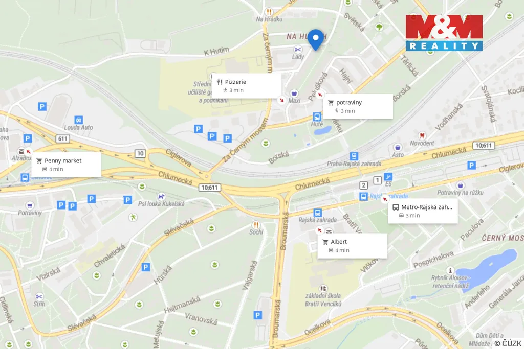 Výborná dopravní dostupnost – metro linky B Rajská zahrada je cca 10 min pěšky. V okolí je park, rybník Na Hutích, OC Černý Most i rychlé napojení na pražský okruh a dálnice D10 a D11.