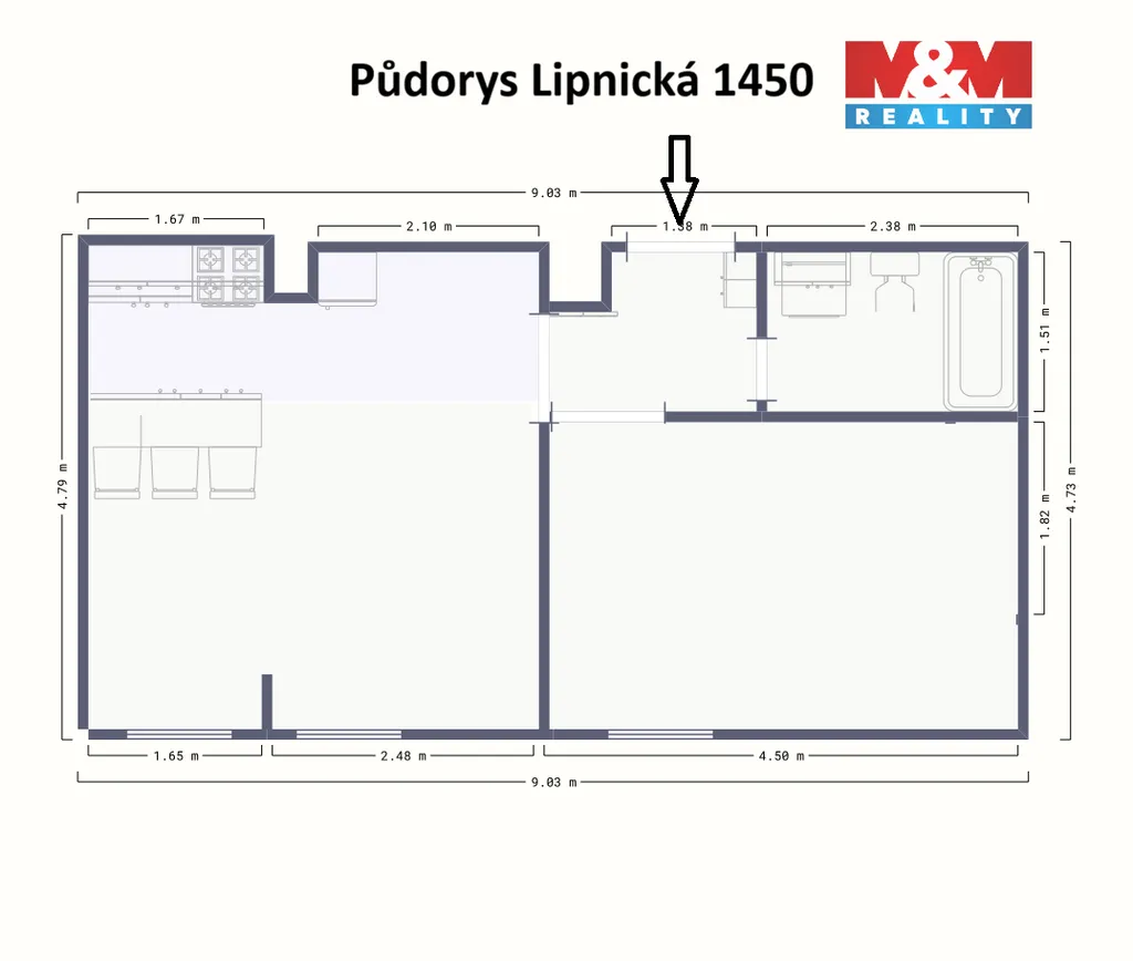 Obývací část je propojena s kuchyňským koutem s praktickým barovým pultem. V koupelně je vana, WC a místo na pračku. Komfort bydlení zvyšují nová okna s izolačními trojskly, která zajišťují klid i energetickou úsporu. Ložnice umožňuje úplné zatemnění pro nerušený spánek.