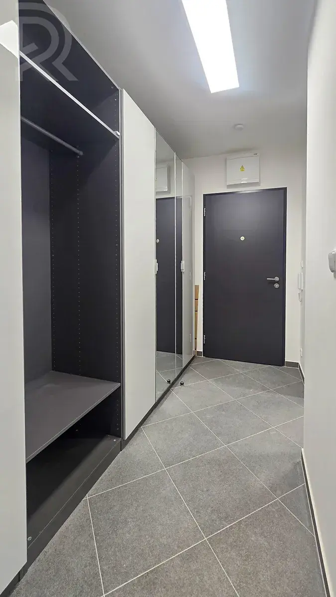 Lze využít barový pult se 2 židlemi. Ty budou dodány v následujících dnech, stejně tak posuvné dveře do ložnice. Na oknech jsou vnitřní žaluzie a jsou již připraveny kolejnice na záclony.