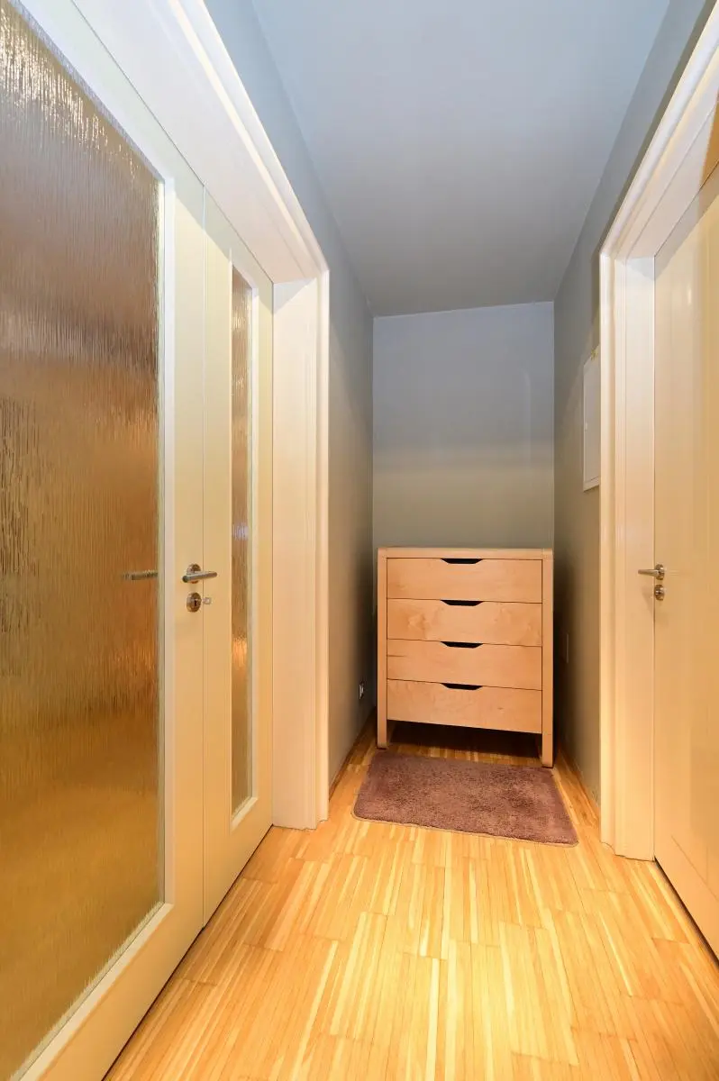 Na podlahách dubová designová mozaika, v koupelně dlažba.