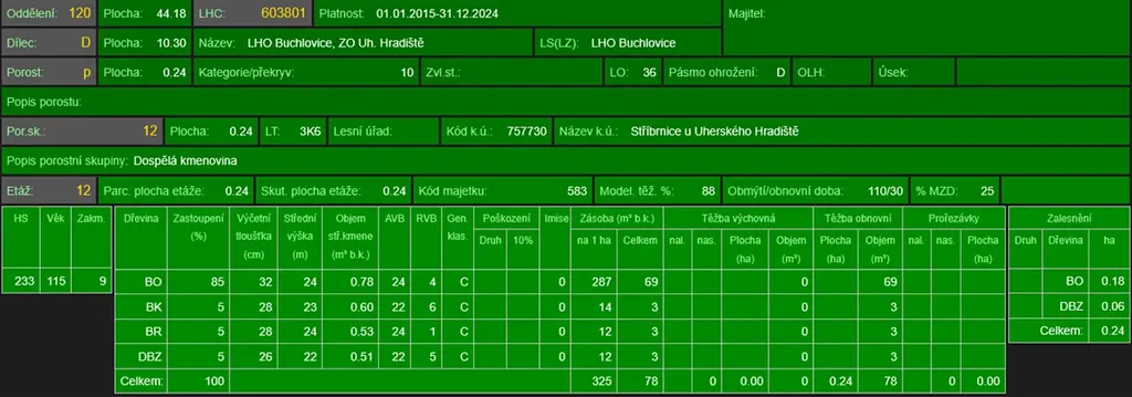 - p.č. 805/2 vedená jako lesní pozemek o celkové výměře 2 350 m2 (stáří lesa 126 let - zastoupení dřevin borovice, buk, bříza, dub),