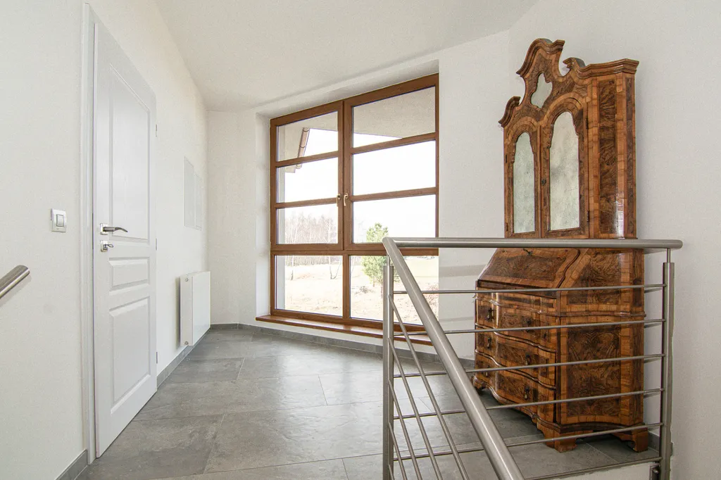 V přízemí se nachází prostorná předsíň s komorou pod schodištěm. Dispozice bytu je praktická a díky velkoformátovým oknům je celý prostor nádherně prosvětlený s výhledy do okolní přírody.
