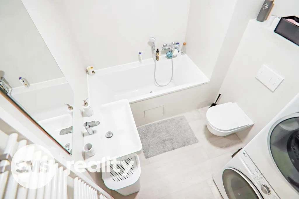 Součástí bytu je základní vybavení: kuchyňská linka se spotřebiči v koupelně je pračka, sušička, klasická vana a umyvadlo.