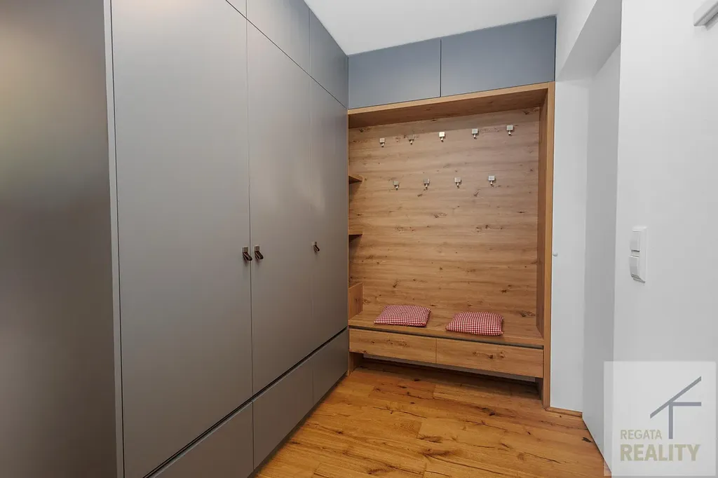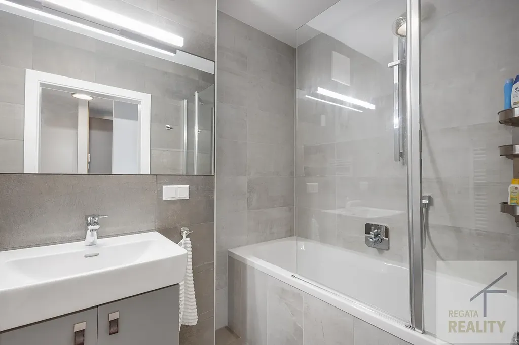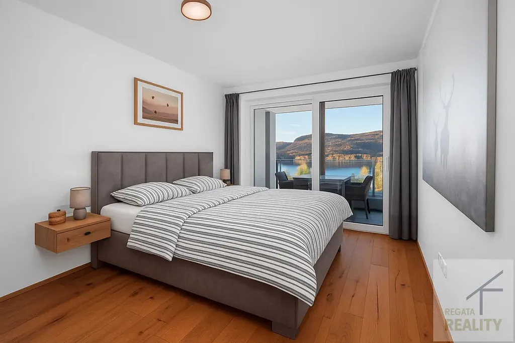 Tento byt o rozloze přibližně 75 m² se pyšní dvěma ložnicemi, prostornou kuchyní s jídelním koutem, koupelnou a samostatným WC. Lodžie o rozloze 10 m² nabízí úchvatný výhled na jezero. Vysoce kvalitní podlahy a vkusné zařízení podtrhují harmonický koncept bytu.