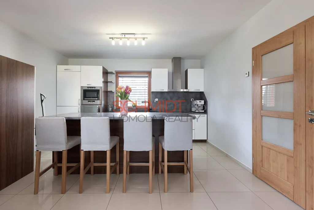 prostorný obývací pokoj spojený s jídelnou a kuchyní se vstupem na terasu, na kterou se dostaneme také z hlavní ložnice. Dále dva dětské pokoje, koupelna s vanou i sprchovým koutem, oddělené WC, technická místnost a v neposlední řadě půdní prostor upravený na další velkou obytnou místnost. Na ni navazuje další část půdy, sloužící jako šatna či sklad.