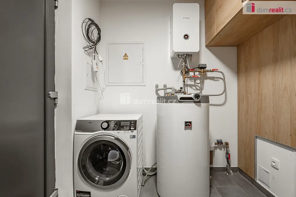 Součástí každé jednotky je samostatná technická místnost s elektrickým kotlem, bojlerem, pračkou a úložnými skříněmi.