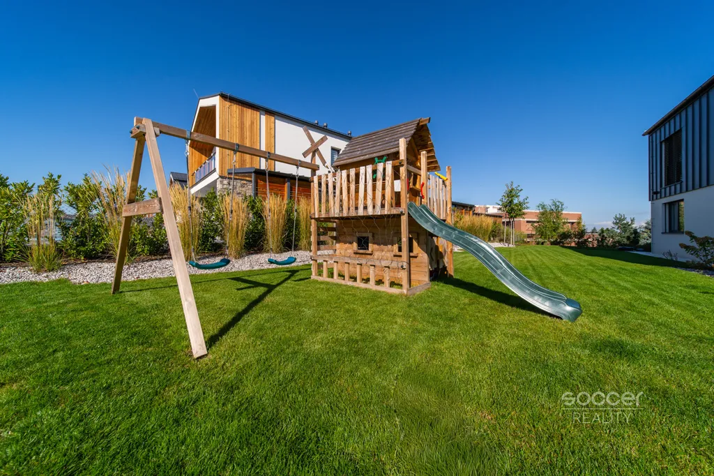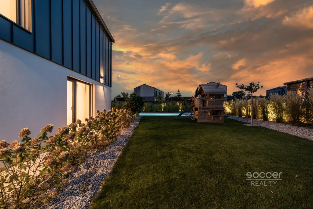 Zahrada je osázena vzrostlou zelení, která zajišťuje naprosté soukromí. Samozřejmostí je automatická závlaha napojená na tři retenční nádrže a dětská herní sestava.