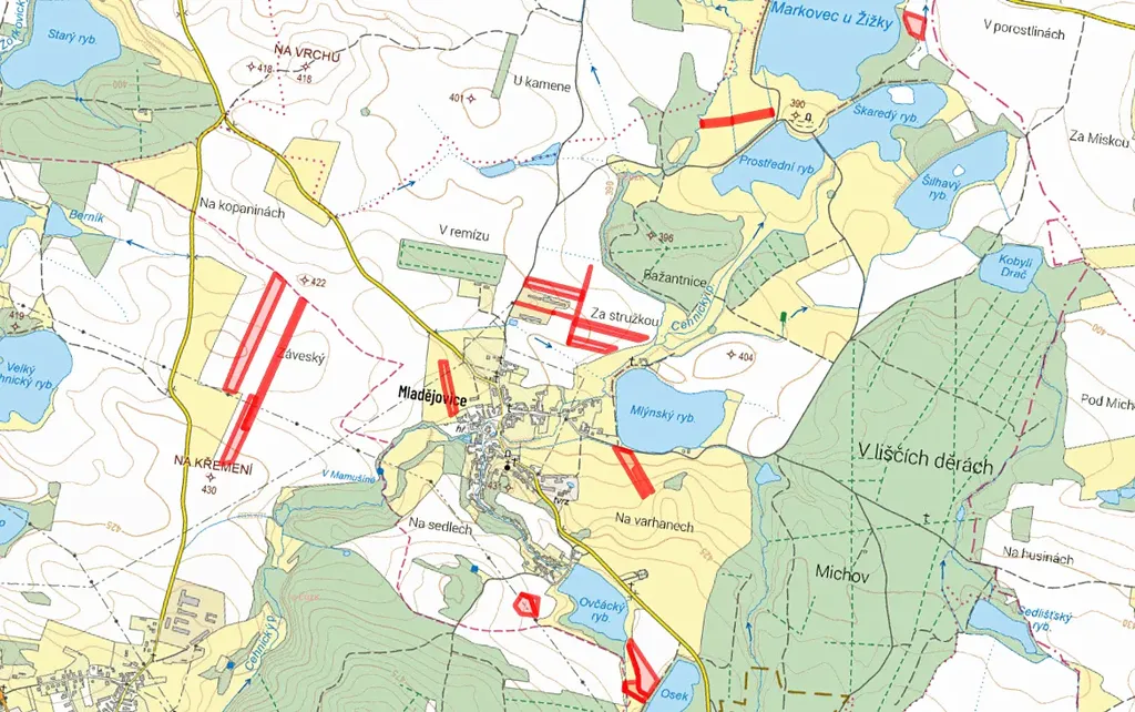 -> parcelní čísla 99/9, 99/25, 99/29, 99/30, 102, 113, 115/10, 164, 245/92, 308/24, 409, 429/45, 439/11 a 484/40 (LV 632)