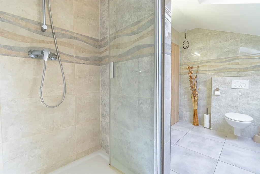 Dispozice: vstup_ zádveří_chodba_kuchyně s jídelním koutem_spodní koupelna se sprch. koutem a prostorem pro pračku_obrovský obývací pokoj s výstupem přes portál na dvůr/zahradu_technická místnost (kotel, zásobník, bojler, expanzka) _WC samostatné_schodiště do patra. V patře 3 pokoje (jeden průchozí)_prostorná koupelna s vanou a sprchovým koutem a s WC.