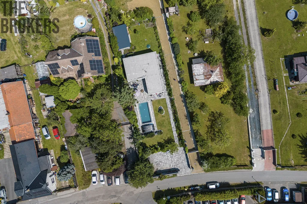 Pozemek o velikosti 850 m² je skutečnou oázou klidu. Zahrada byla navržena zahradním architektem a nabízí harmonickou kombinaci vzrostlých keřů, dřevin i květin. Samozřejmostí je automatický zavlažovací systém (kapénková závlaha i rozstřik) a akumulační nádrž na dešťovou vodu ze všech střech. Součástí je také užitková zahrádka se závlahou a krásný trávníkový koberec za domem, který vytváří ideální prostor pro odpočinek i rodinné aktivity.
