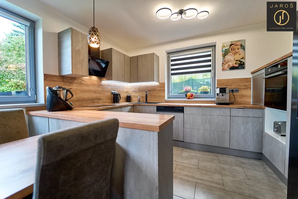 Celý dům je postaven z ytongu, Má šedá plastová okna s trojsklem, vnitřní žaluzie den a noc. Přehled o okolí domu Vám zajistí kamerový systém se záznamem.