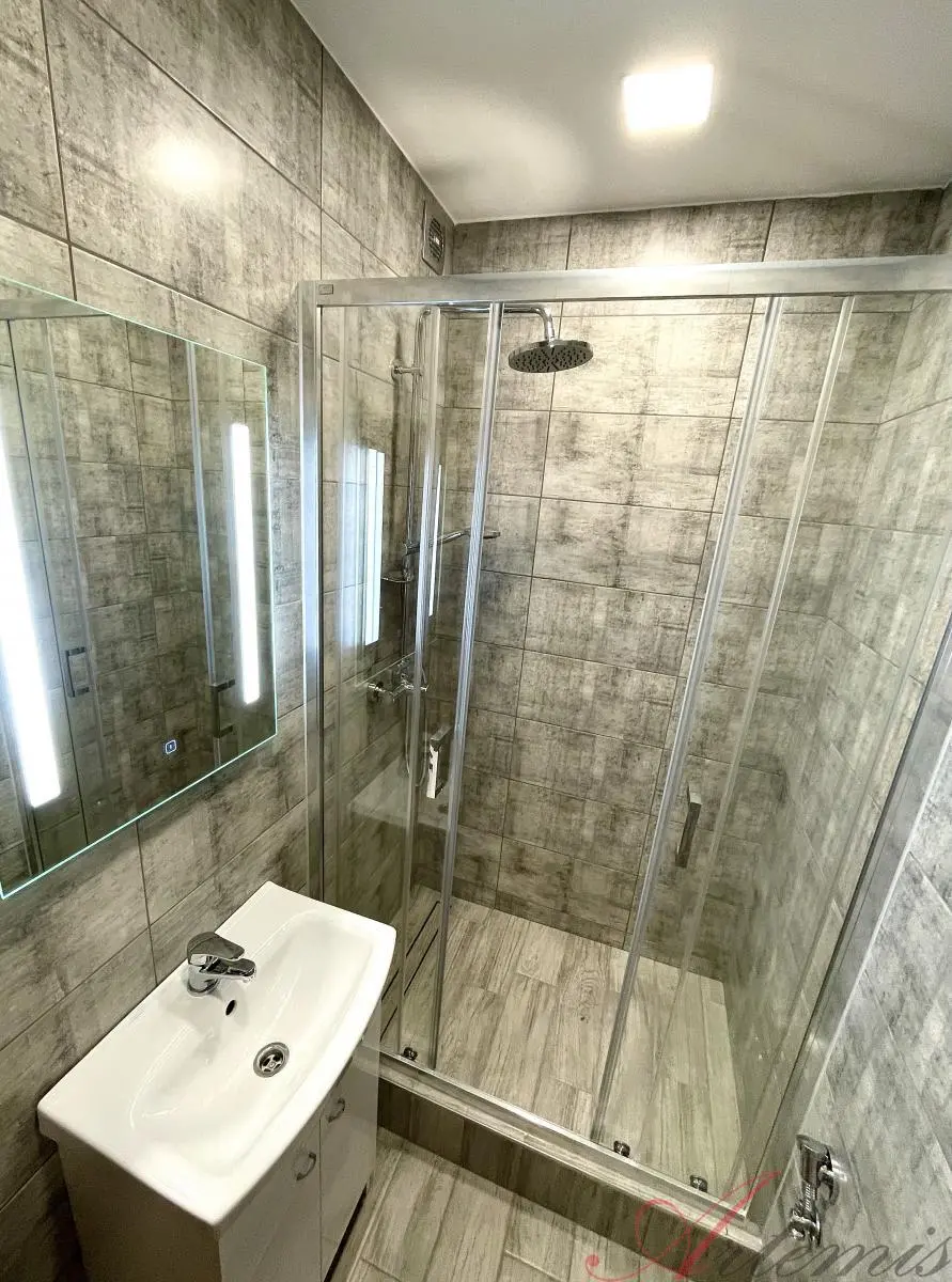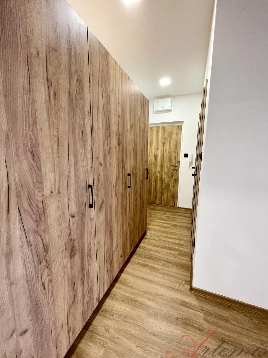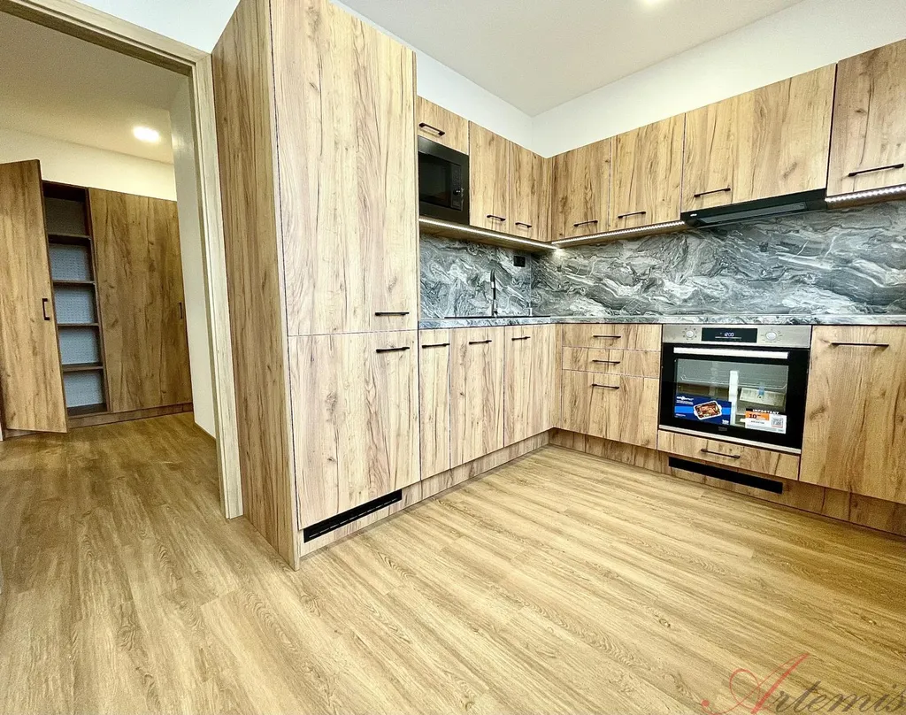 Nově zrekonstruovaný slunný byt je situován na jihovýchodní stranu a nachází se v sedmém podlaží revitalizovaného domu. Disponuje kuchyňskou linkou s indukční varnou deskou, elektrickou troubou, vestavnou lednicí, mrazákem, myčkou, mikrovlnnou troubou, neméně digestoří. (výrobce Beko) Podlahové krytiny tvoří vinylové plovoucí podlahy, v sociálním zařízení je dlažba. Koupelně dominuje prostorný sprchový kout, chodbě objemná šatní skříň.