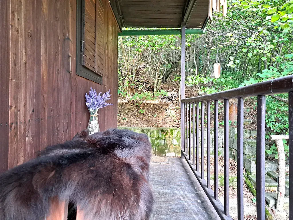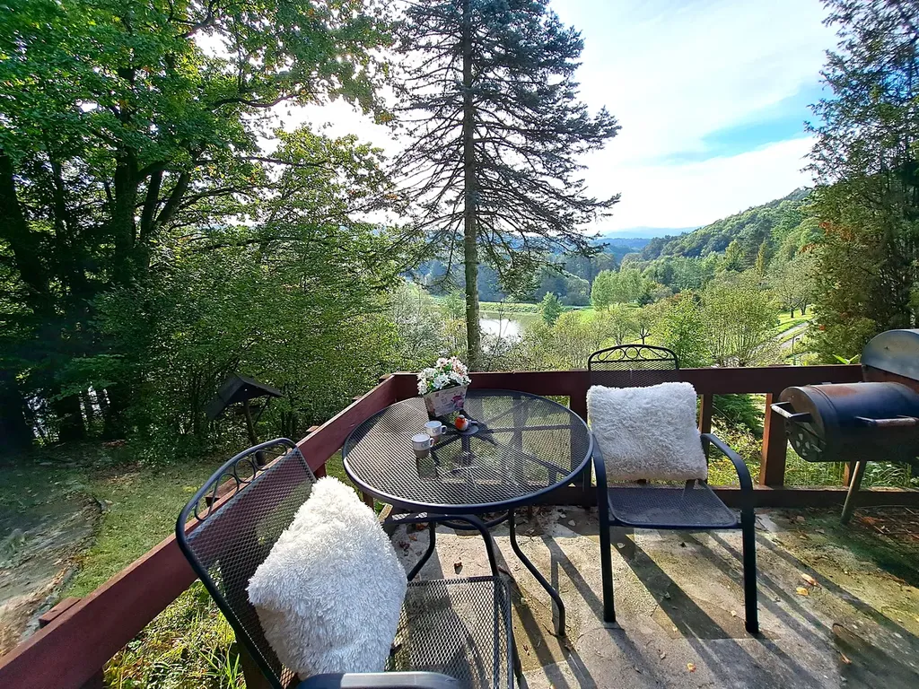 V přízemí se nachází kuchyňská linka s jídelním koutem a krbovými kamny. V horním patře pak chodba se vstupem do ložnice, suché WC. Chata disponuje velkou terasou s grilem a posezením, která nabízí krásný výhled do zeleně a na přilehlý rybník, kde je ráj pro rybáře. U chaty je také vybudované zázemí s ohništěm a udírnou.