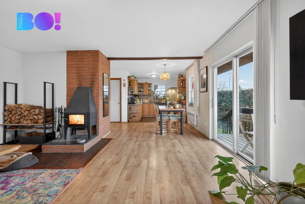 Kuchyně s jídelnou plynule navazuje na obývací pokoj s krbovými kamny a vstupem na terasu. Dále ložnice s vlastní koupelnou, samostatný pokoj a druhá koupelna. V přízemí domu také nalezneme vstup do sníženého suterénu domu a prostornou dvougaráž.