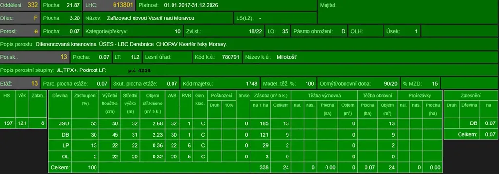 - p.č. 4253 vedená jako lesní pozemek o celkové výměře 712 m2 (stáří lesa 130 let - zastoupení dřevin jasan, dub, lípa, olše),