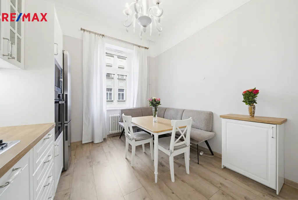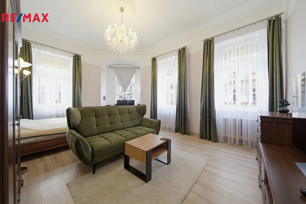Byt je zařízen stylovým nábytkem, který harmonicky ladí s prostornými místnostmi a vysokými stropy o výšce 3,6 m. Jedna z velkých místností je díky promyšlenému zónování rozdělena na ložnici a obývací část, přičemž zde zůstává i prostor vhodný pro pracovní kout nebo domácí kancelář.