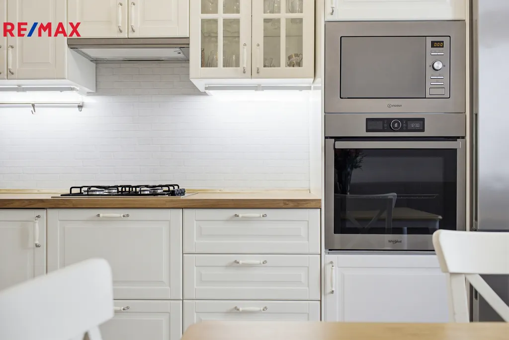 Kuchyně je vybavena kvalitními vestavěnými spotřebiči a nabízí také místo pro relaxační zónu. Právě díky tomuto uspořádání lze byt prakticky využívat jako dispozici 3+kk.