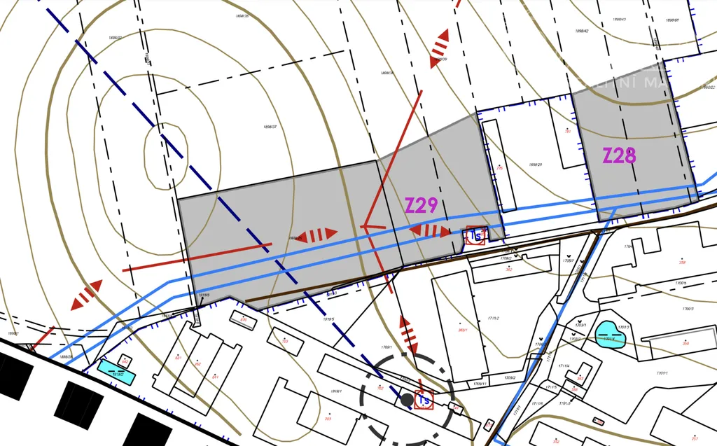 Celá plocha je v zastavitelném území. Dle územního plánu se jedná o plochy smíšené výrobní - výrobny a provozovny živnostenského charakteru (označení VS - Z29). Maximální celková zastavěná plocha je 1500 m². Možno postavit např. výrobní či skladovací halu. Max. výška stavby/budovy 15 m (1+P). Pozemek lze do budoucna rozdělit až na 4 parcely (minimální velikost každého nově vzniklého pozemku bude 2500 m²). Nyní však prodáváme jako celek.