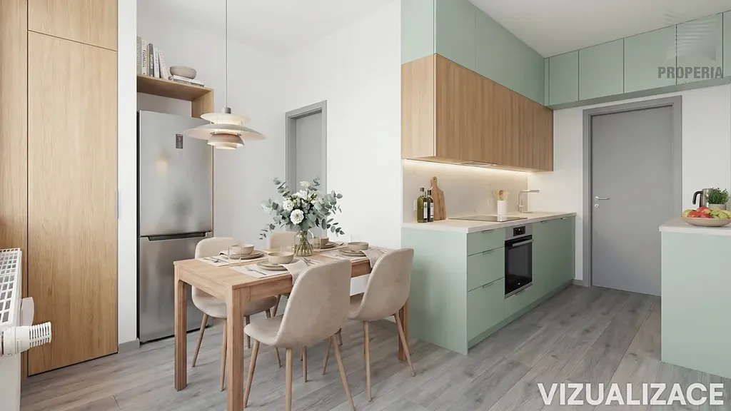 Dispozice bytu je přehledná a dobře čitelná. Dvě ložnice jsou orientovány na jižní stranu, přičemž z jedné z nich je vstup na lodžii, která přináší příjemný kontakt s venkovním prostorem a dostatek denního světla. Kuchyně spolu s obývacím pokojem směřují na sever a zajišťují příjemné klima v obytné části bytu.