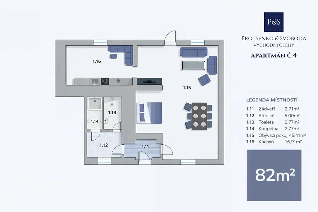 • Apartmán 4 (1. NP, 1+1, 72,42 m²) – skvělý pro páry nebo krátkodobé pobyty