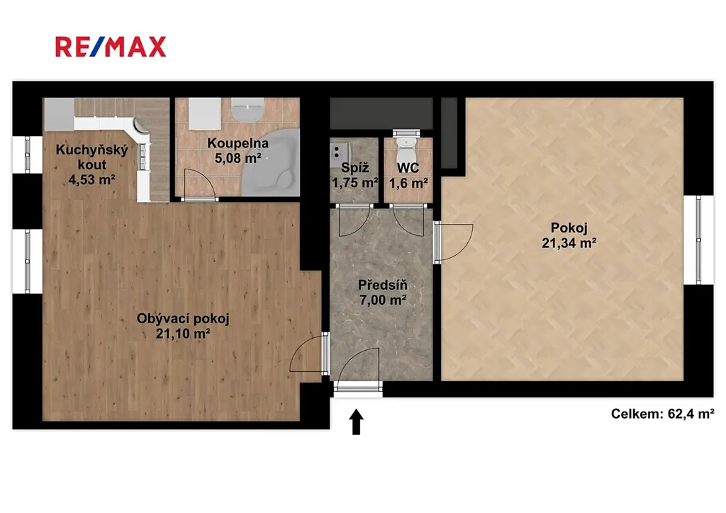 Byt je členěn na obývací kuchyň (cca 25m²), pokoj (cca 21m²), předsíň (cca 7m²), koupelnu (cca 5m²), toaletu (1,5m²), komoru (cca 1,75m²).