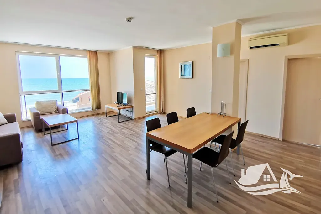Celková plocha apartmánu činí 104 m², z čehož obytná plocha představuje 91 m². Dispozice zahrnuje vstupní předsíň, prostorný obývací pokoj spojený s jídelnou a plně vybaveným kuchyňským koutem, hlavní ložnici s vlastní koupelnou a balkonem, druhou ložnici s přístupem na společný balkon, další koupelnu a toaletu. Z obou balkonů i všech oken apartmánu se otevírá dechberoucí výhled na moře, který dodává celému prostoru jedinečnou atmosféru.