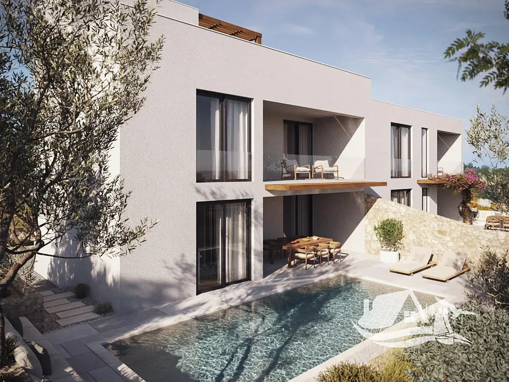 V atraktivní a klidné části města Vodice vzniká moderní dvojdům zajímavého designu, který spojuje soukromí, prostor a výhledy na moře i město. Nemovitost se nachází přibližně 1500 metrů od pláže a 1100 metrů od centra, což představuje ideální rovnováhu mezi klidem rezidenční čtvrti a dostupností všeho důležitého.