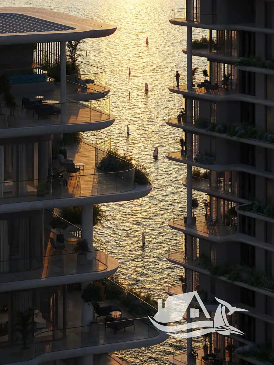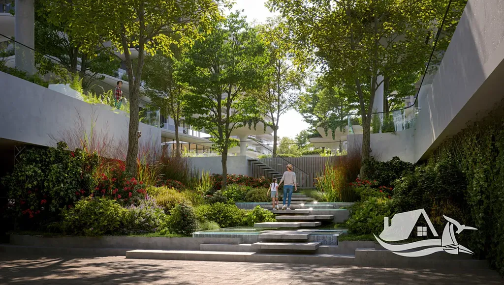 Zeleň není jen okolo budov, ale přechází i do fasád a společných podií. Výsledkem je dojem, že budovy „rostou ze země“ a jsou formované mořem a větrem.