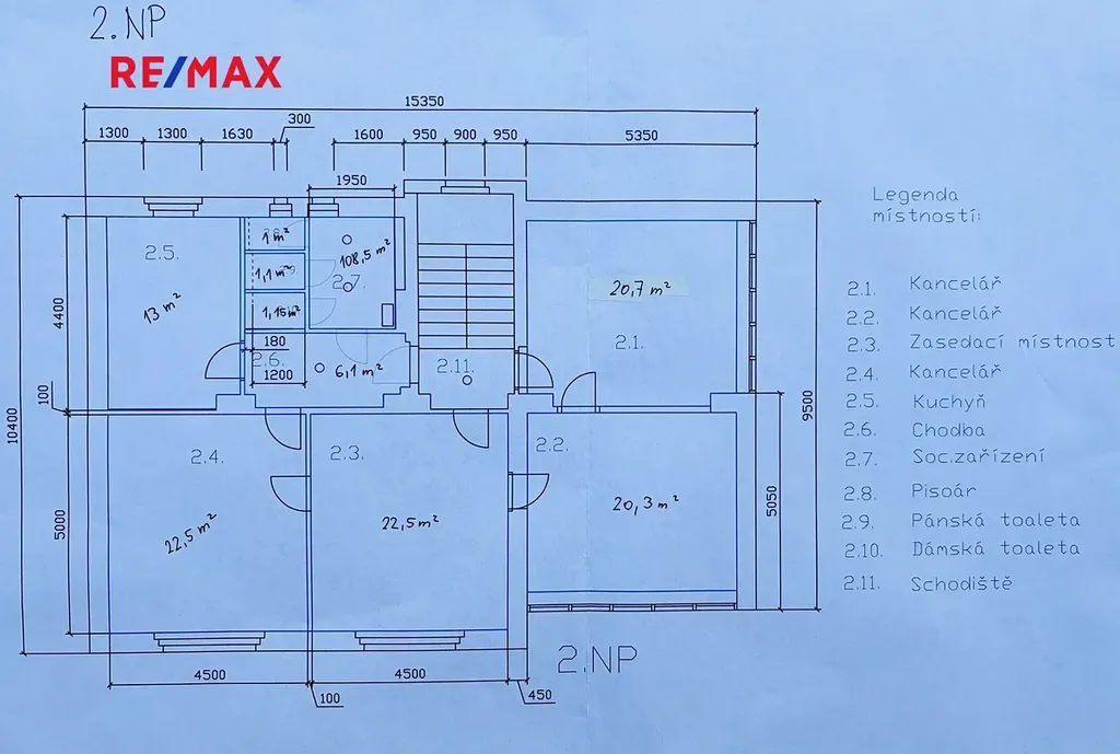 - Sociální zázemí: sprcha, 2× WC a pisoár