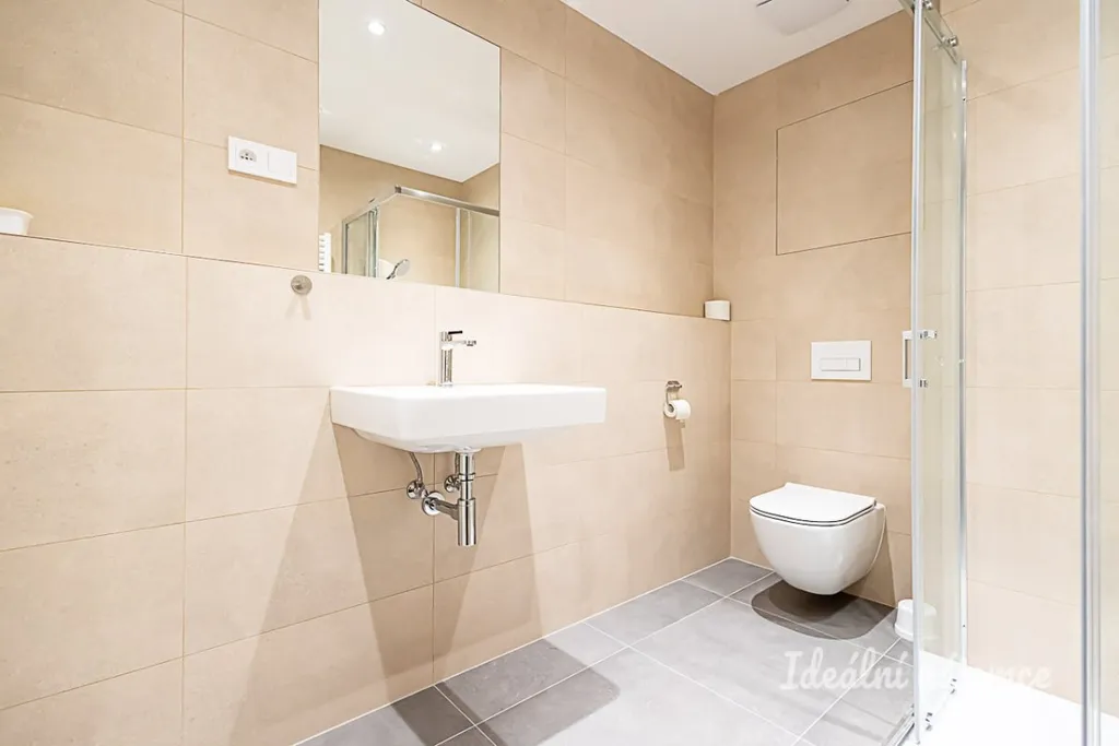 Koupelna je moderně řešená s velkoformátovou dlažbou až ke stropu. Nachází se zde prostorný sprchový kout s nízkým vstupem, umyvadlo se zrcadlem a toaleta. Nechybí ani přípojka na pračku.