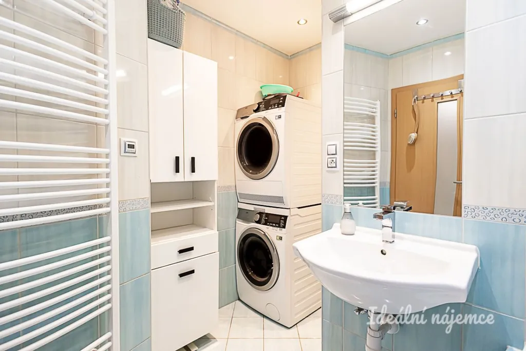 V koupelně se nachází vana, umyvadlo se zrcadlem, koupelnová skříňka a WC. Součástí bytu je také lodžie, která rozšiřuje obytný prostor a nabízí příjemné místo k odpočinku. Praktickým bonusem je rovněž sklep pro uložení sezónních věcí.