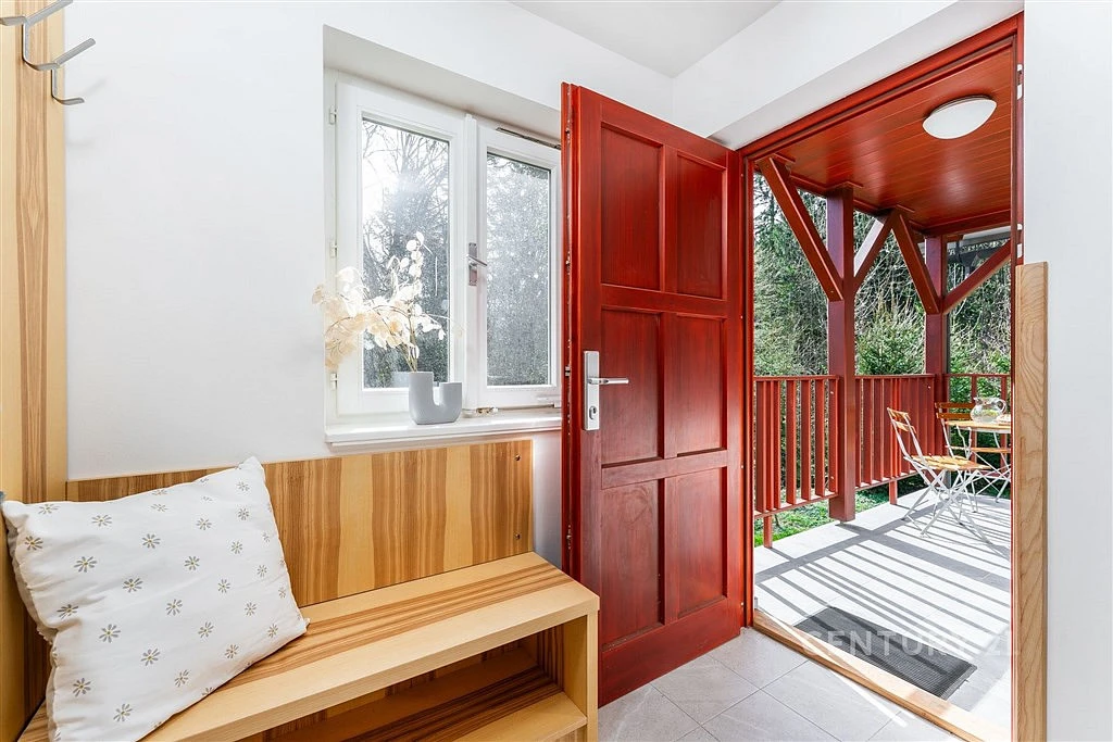 Ta byla celá nově postavena na místě původní dřevěné, aby dokázala nabídnout komfort a současně odpovídala nárokům, ze kterých dnes už nechceme slevit ani v lůně přírody. Pověstnou třešinkou na dortu je pak útulné dřevěné podkroví s nábytkem z truhlářské dílny na míru.
