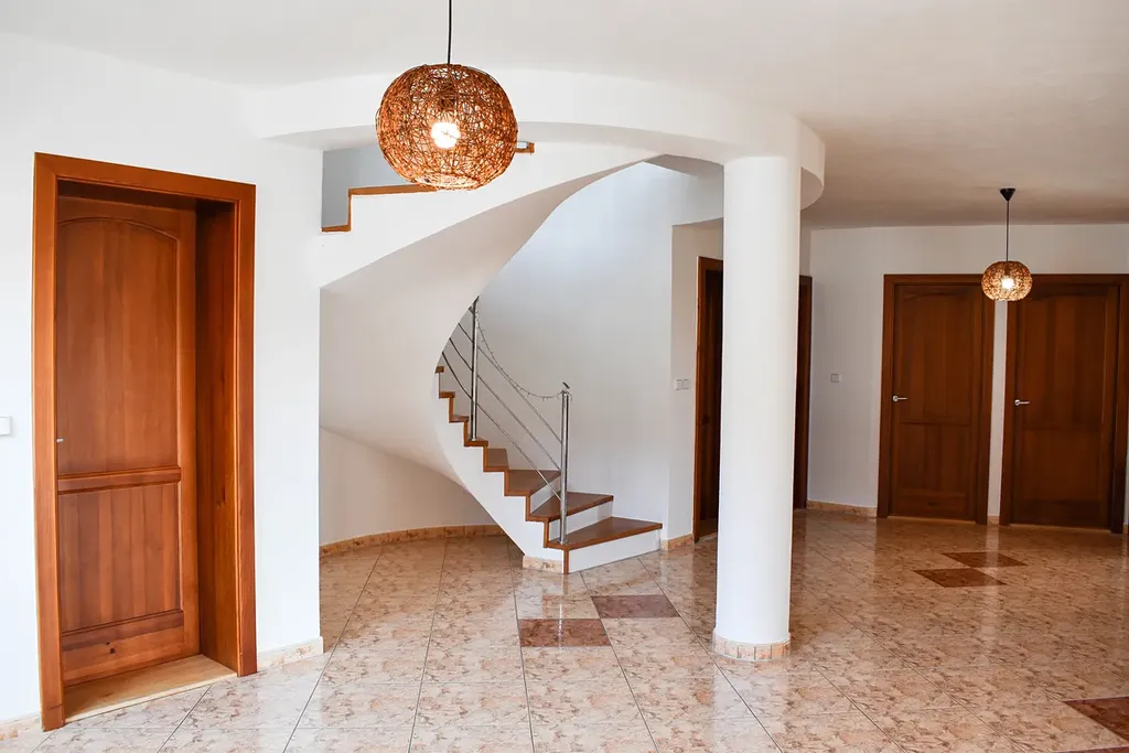 Prostorný obývací pokoj je propojený s kuchyní a jídelnou se vstupem na zahradu. Součástí prvního podlaží je technická místnost, šatna a pokoj pro hosty. V obou podlaží se nachází koupelna.