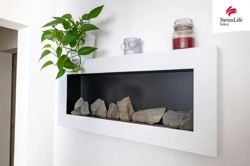 V obývacím pokoji Vás zaujme netradiční designový prvek dekorativní břízy, které vytváří útulnou a jedinečnou atmosféru. V zimních měsících si navíc můžete užívat teplo a zpříjemnit večery u bio krbu, který nejen krásně vyhřeje obývací pokoj, ale také přidává na pohodlí.