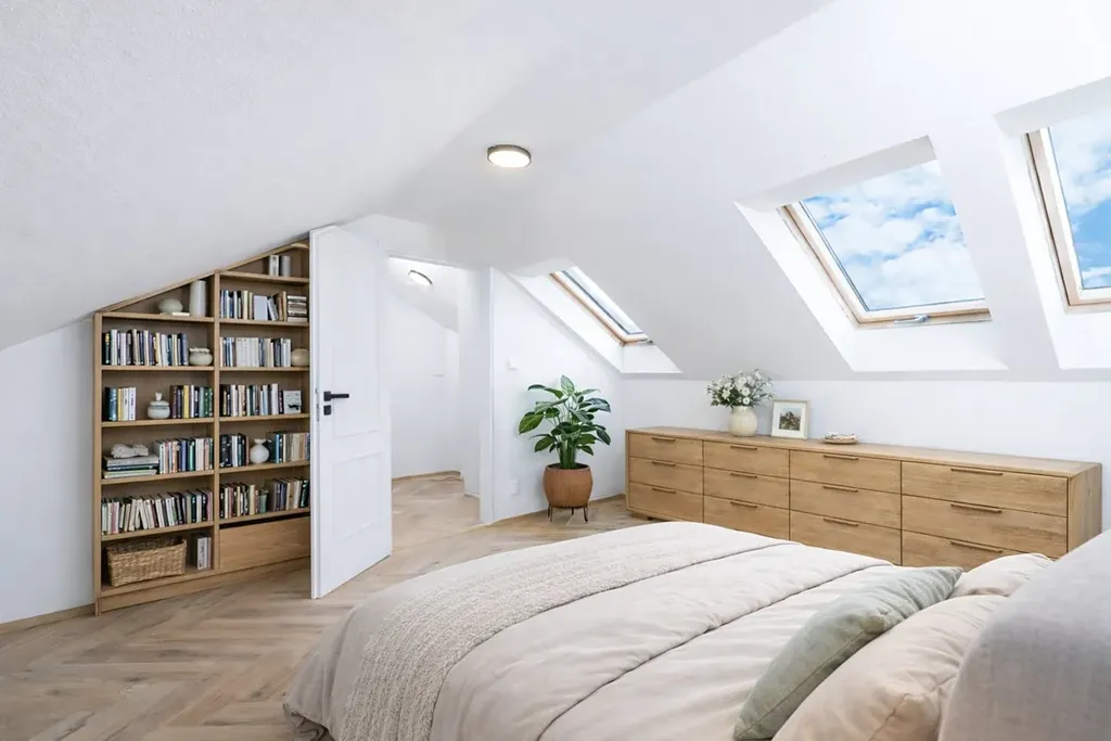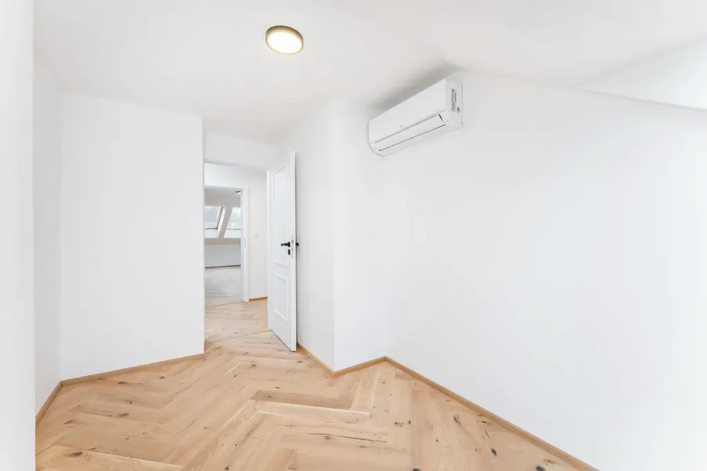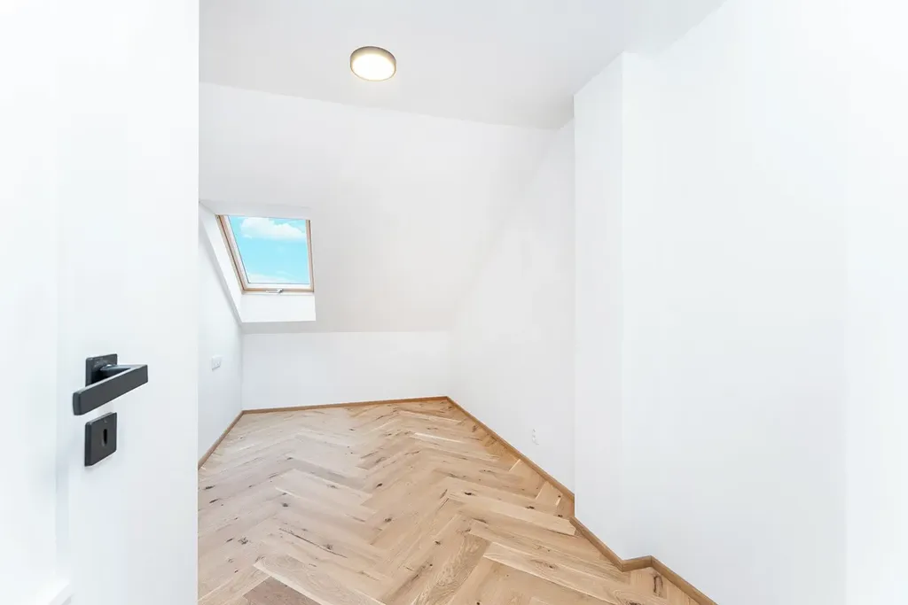Vstupní úroveň bytu tvoří prostorná předsíň s místem pro vestavěné úložné prostory, světlý obývací pokoj s kuchyňským koutem, koupelna se sprchovým koutem a dvě samostatné ložnice. Horní patro nabízí klidovou zónu – průchozí pokoj ideální jako pracovna či knihovna, oddělenou šatnu a hlavní ložnici s vlastní koupelnou a vanou, která poskytuje maximální komfort a soukromí.