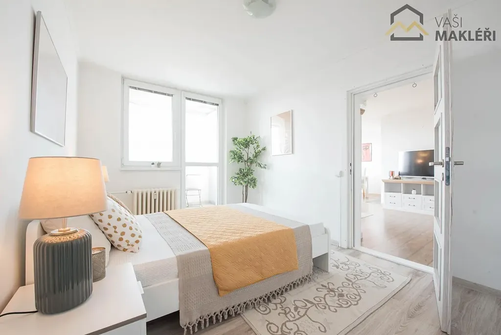 Interiér nemovitosti je přizpůsoben současným potřebám bydlení s důrazem na pohodlí a praktičnost. Rozložení místností můžete načerpat z přiloženého půdorysu, jedná se o oblíbené dispoziční řešení s členěním na obývací pokoj (včetně jídelní části) s kuchyňským koutem (plně vybavená kuchyňská linka, kvalitní spotřebiče, vestavěná chladnička), prostornější ložnici (vestavěná skříň a vstup na zasklenou lodžii), opravdu prostorný dětský pokoj (lze pohodlně rozdělit na dva samostatné pokoje), koupelnu s vanou (jádro bylo vyzděno a zvětšeno), samostatnou toaletu (nové stoupající rozvody) a příjemné zádveří (možnost úložných prostor). Jako další úložný prostor lze využít sklep a ke společnému užívání jsou dvě kolárny.