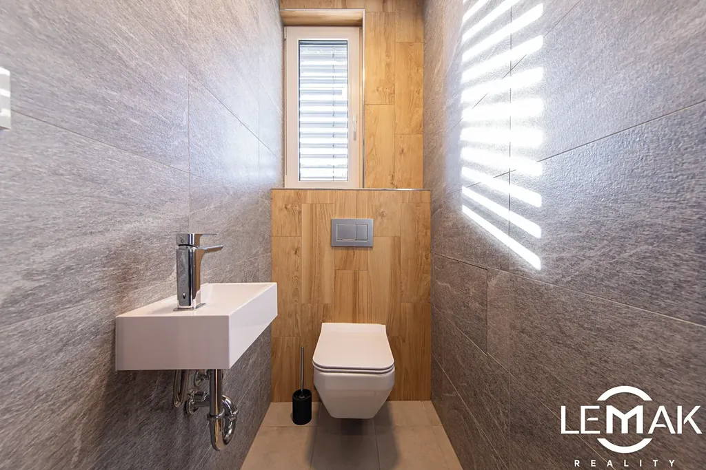 Dispozice domu je promyšlená do posledního detailu. V přízemí najdete vstupní chodbu, samostatné WC, prostorný obývací pokoj se vstupem na slunnou zahradu, koupelnu vybavenou vanou i sprchovým koutem, samostatný pokoj a plně vybavenou kuchyni. V patře dominuje dlouhý koridor, který vede ke třem neprůchozím pokojům, odkládací místnosti a dalšímu WC se sprchovým koutem. Jeden z vrchních pokojů navíc nabízí přímý vstup na balkon.