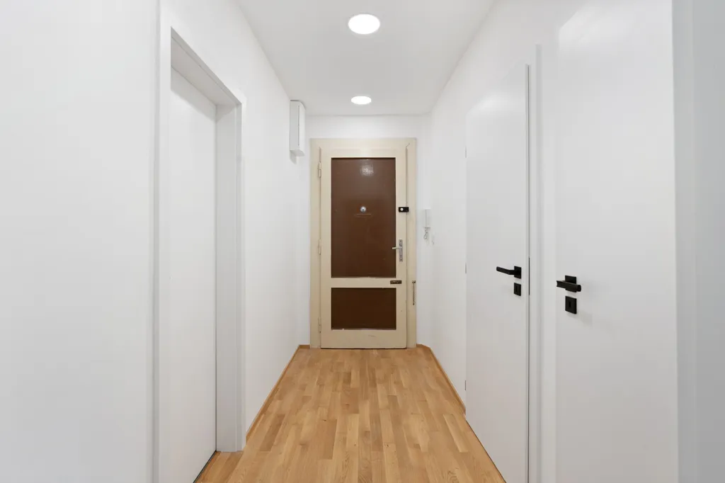 Dispozice bytu: prostorná předsíň, koupelna, samostatné WC, komora, ložnice a obývací pokoj s kuchyňským koutem orientovaná do vnitrobloku. Dům má udržované společné prostory a menší vnitřní dvůr, který je k dispozici pro obyvatele domu.