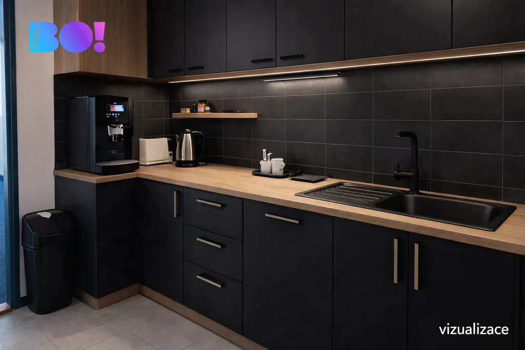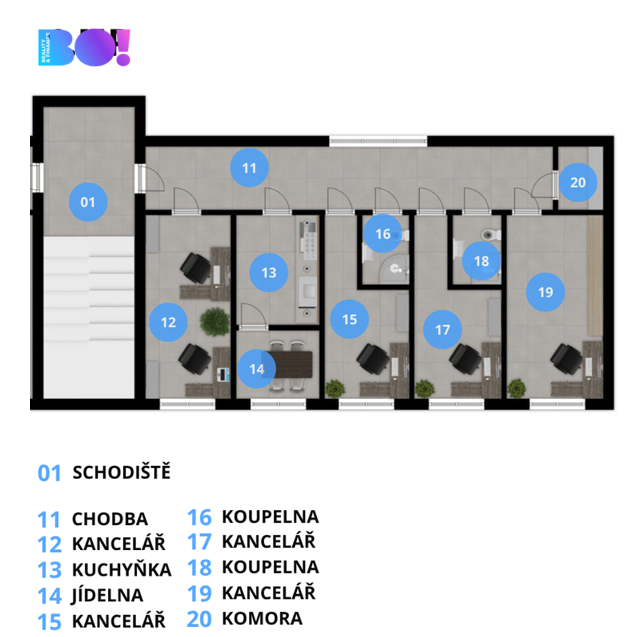 Promyšlené dispozice: Světlé kanceláře, zázemí pro tým, sociální zařízení a open space vhodný pro recepci či společné pracoviště.