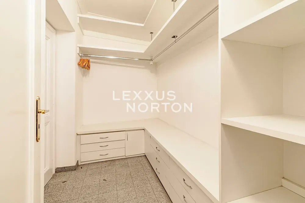 Obývací pokoj je zařízen sedací soupravou, jídelním stolem a komodou, kuchyň je plně vybavena spotřebiči, mezi které patří lednice s mrazákem, mikrovlnná trouba, myčka nádobí, konvektomat a sporák. Ložnice disponuje postelí a úložnými prostory. Koupelna je vybavena vanou, sprchovým koutem, toaletou a bidetem. Součástí bytu je také pračka.