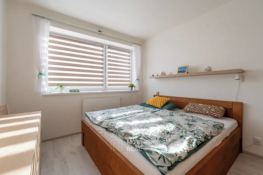 Dispozice bytu zahrnuje ložnici o rozměrech 12 m², prostorný obývací pokoj spojený s kuchyní o velikosti 25 m², chodbu o rozloze 6 m², koupelnu o velikosti 5,5 m² a samostatné WC o velikosti 1,5 m². Podlahy v kuchyni a ložnici jsou plovoucí, v ostatních prostorách je dlažba, což zajišťuje snadnou údržbu a moderní vzhled.