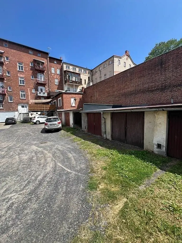 Zděná garáž v centru města na vlastním pozemku se zajištěným příjezdem věcným břemenem chůze a jízdy.
